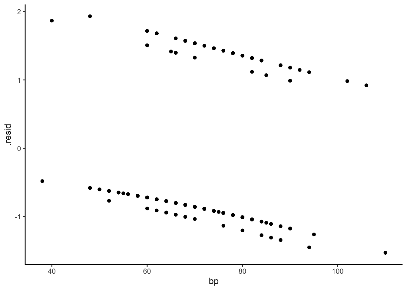 Ordinary residuals for logistic regression exhibit this sort of grouping structure, as do standardized residuals (type = "pearson") and deviance residuals (type = "deviance"). These plots are not useful for interpretation.