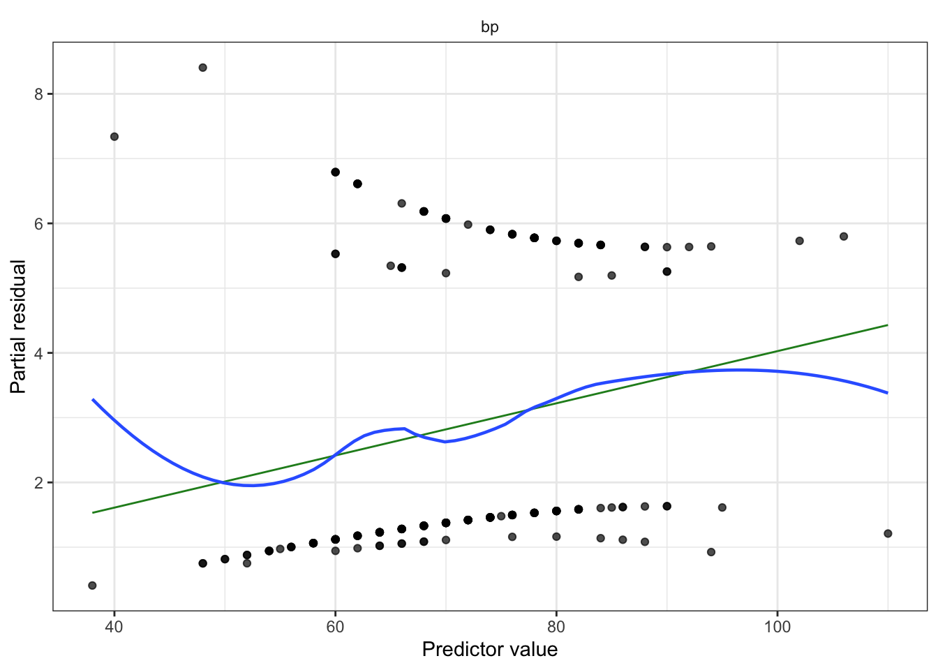 Partial residuals (look for remaining nonlinearity with log-odds, adjust model as needed). Diagnostic for nonlinearity between regressors and log-odds.