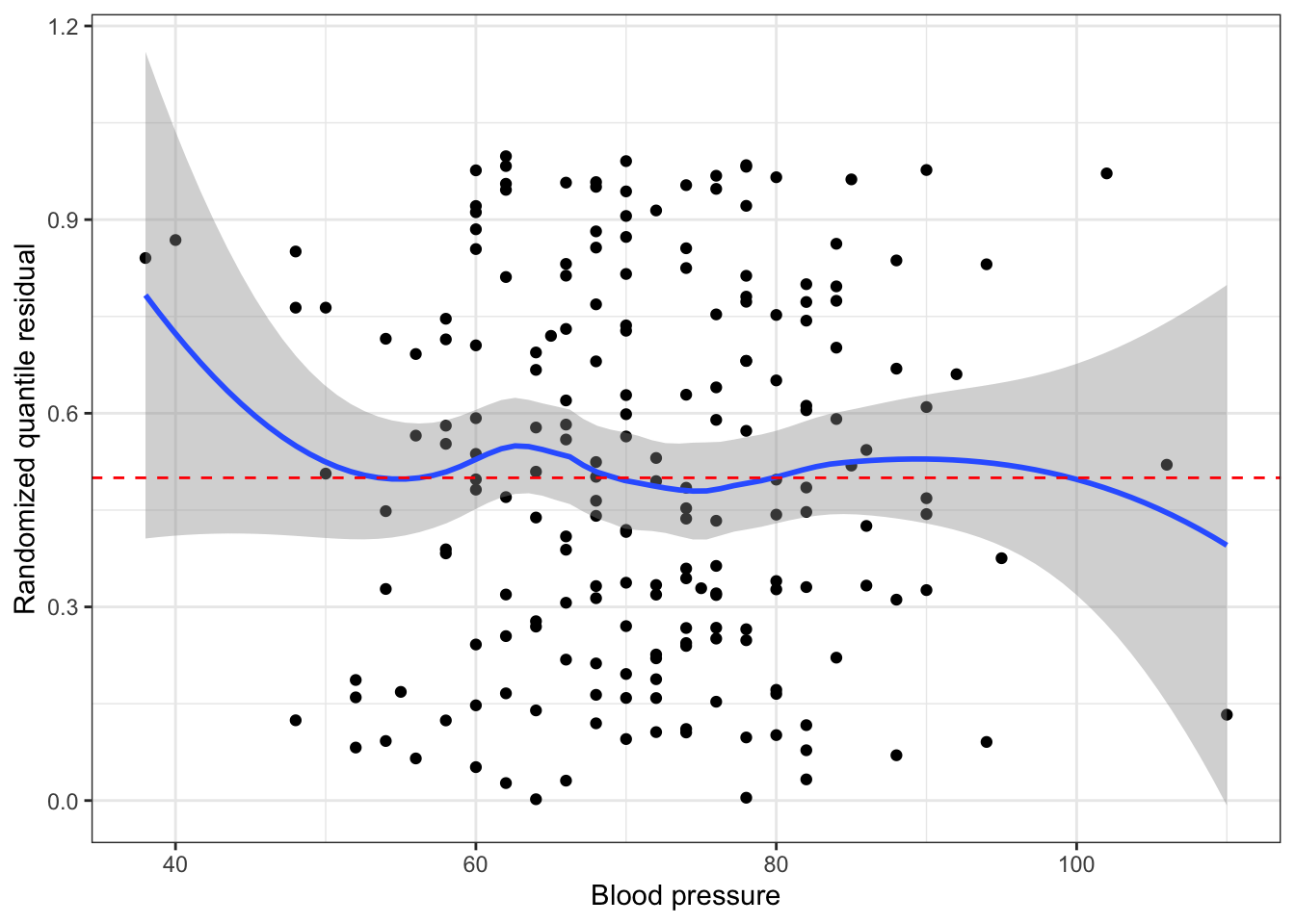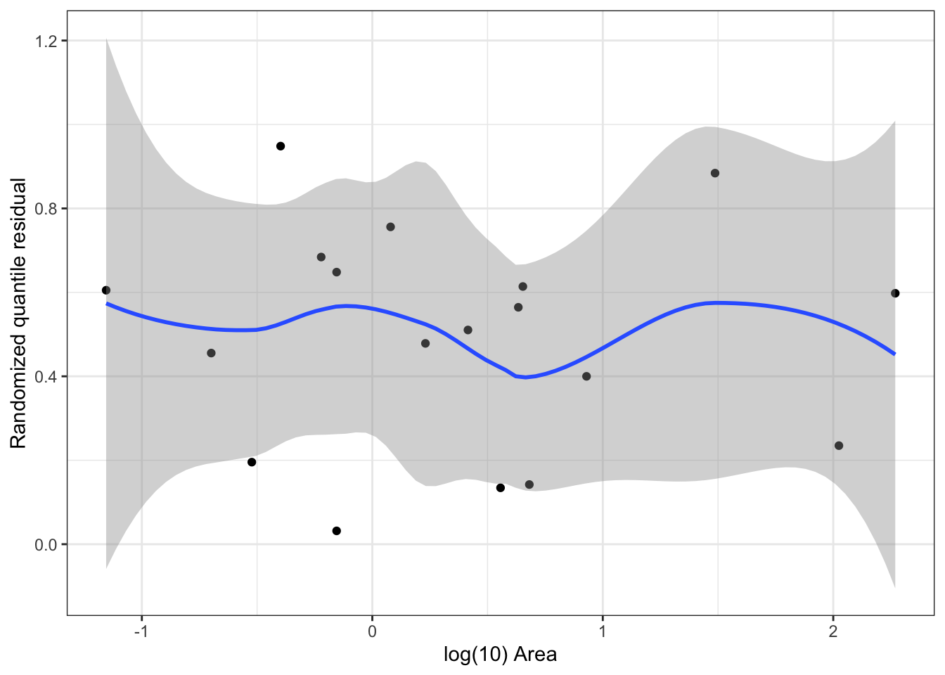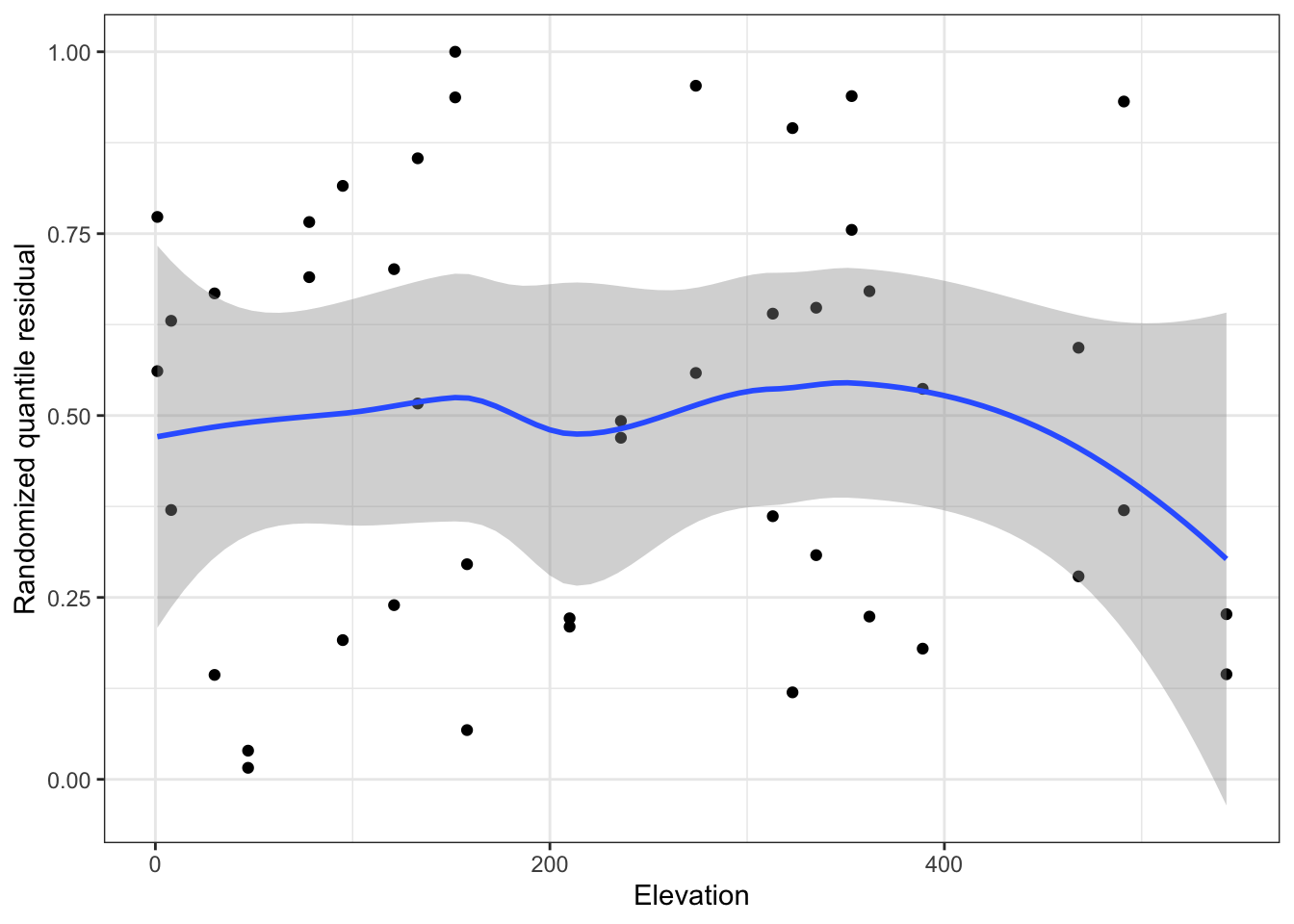 Plot randomized quantile residuals against each predictor. Plot QQ plot (uniform distribution). This is a second diagnostic for nonlinearity.