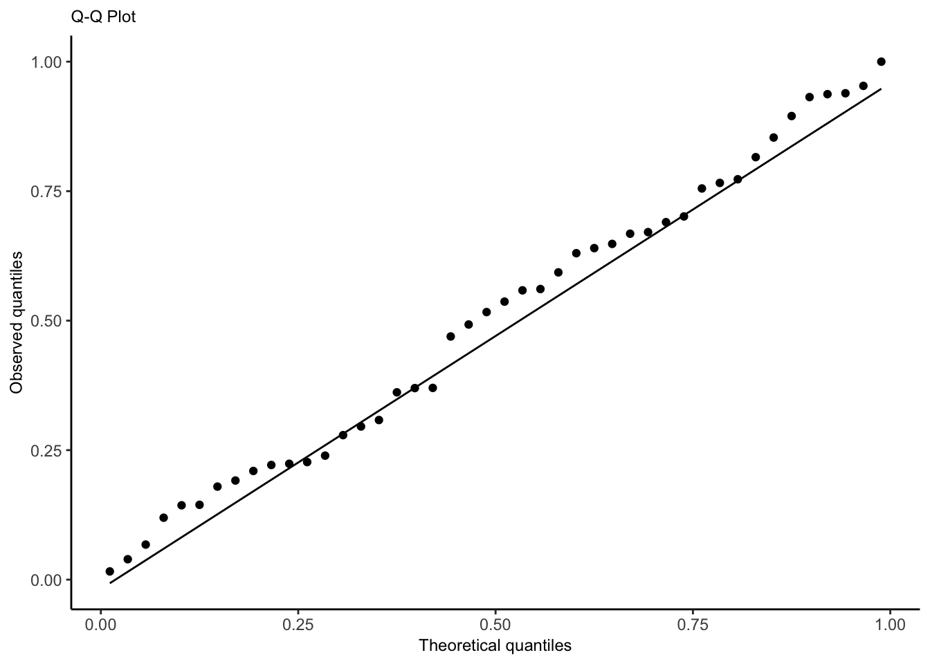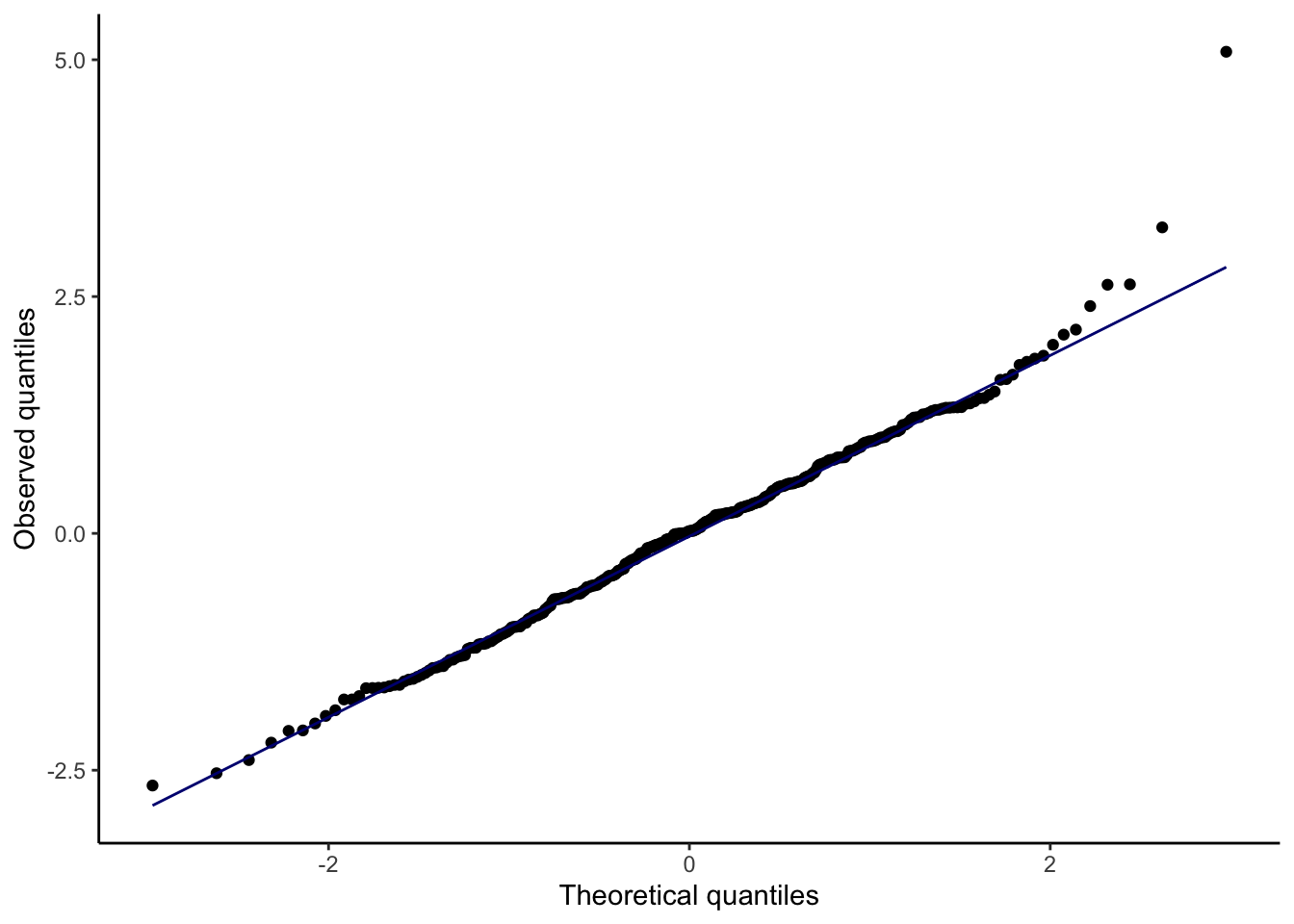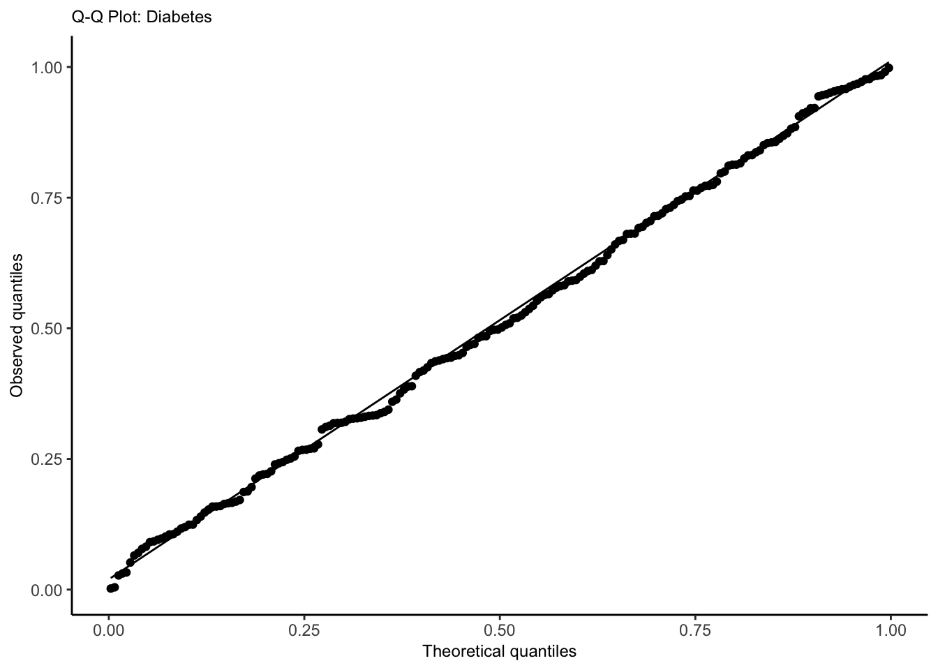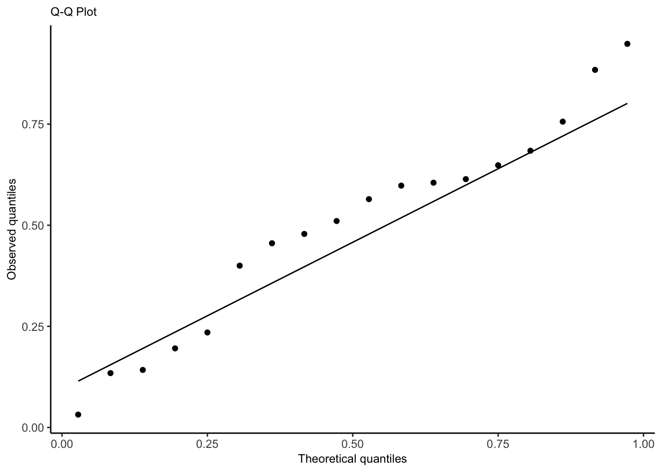 We also assume \(\mathbf{X}\) is fixed, not random. Assumptions 1 and 2 can be checked with a plot of residuals vs. fitted values, while Assumption 4 can be checked with a quantile-quantile plot of the standardized or studentized residuals.