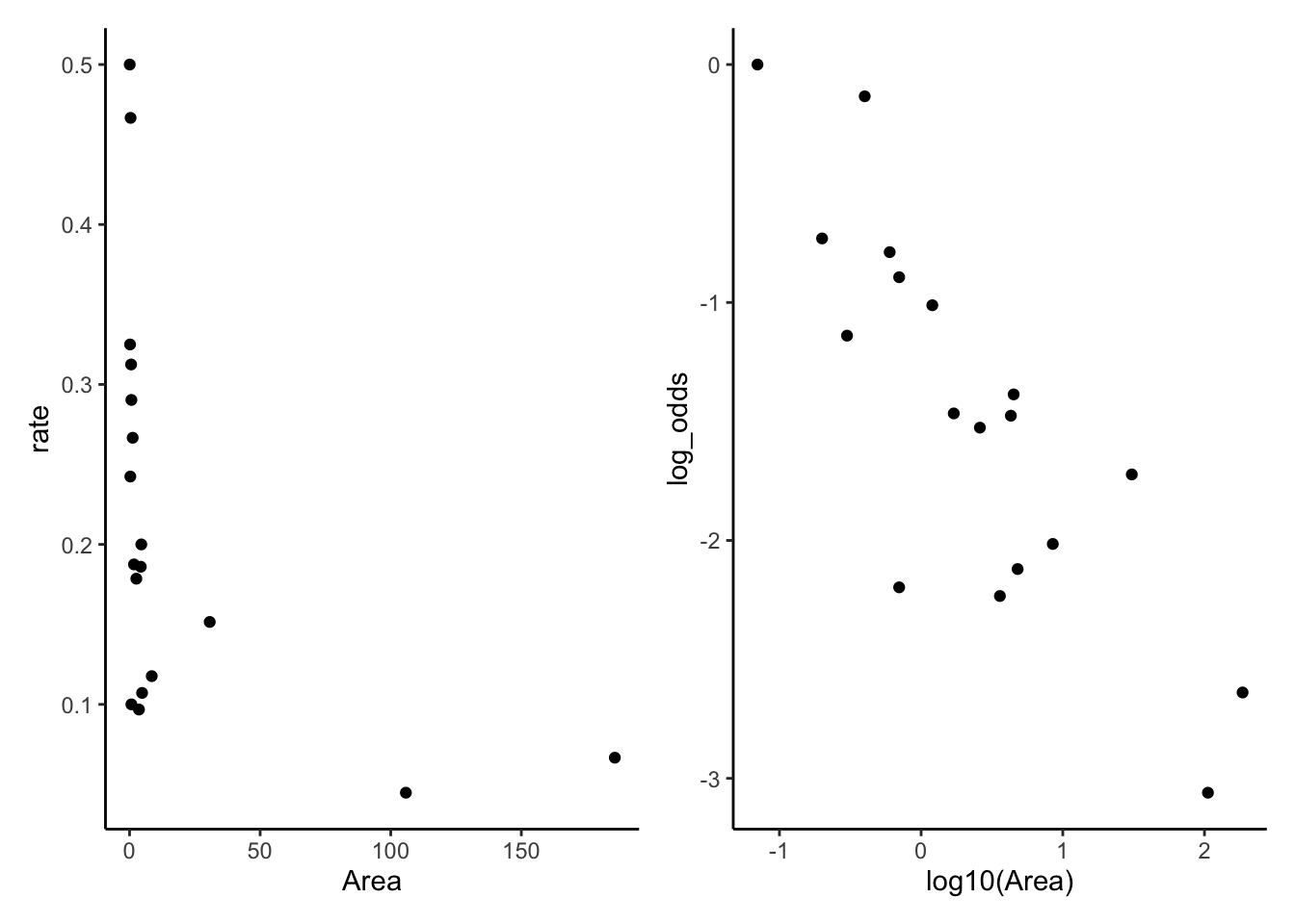 We could choose to model the number of deaths as approximately Poisson, given the death rate, including \(P\) as an offset term in order to account for the different group sizes. The choice of Poisson is approximate, because there is an upper bound to the number of deaths in any age bucket based on the number of people in the study in that age bucket, but as long as the death rate is low, the Poisson will assign very little probability to impossible death numbers.