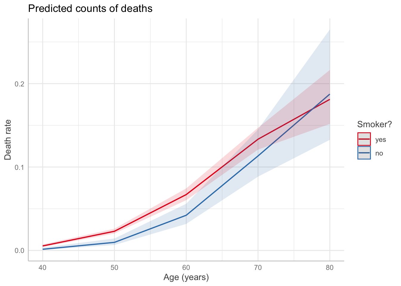 smoke_fit <-glm(deaths ~ (age +I(age^2)) * smoke, offset =log(py), # include with coefficient 1data = smokers, family =poisson(link ="log"))predict_response(smoke_fit, terms =c("age", "smoke")) |>plot() +labs(x ="Age (years)",y ="Death rate",title ="Predicted counts of deaths",color ="Smoker?")