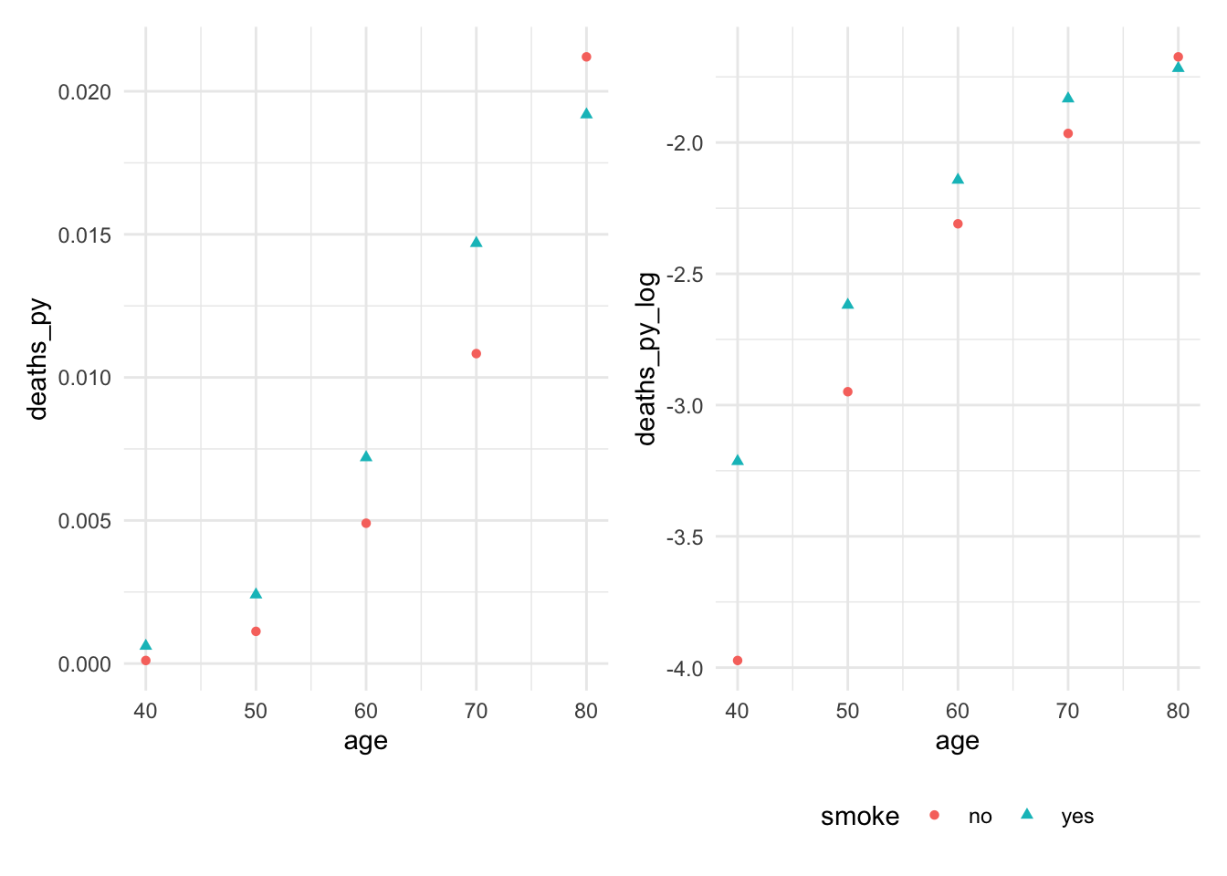 Check to see if predictor is linearly related with log of the rate. We see that the relationship between age and log(death proportion) is non-linear and varies with smoking status.