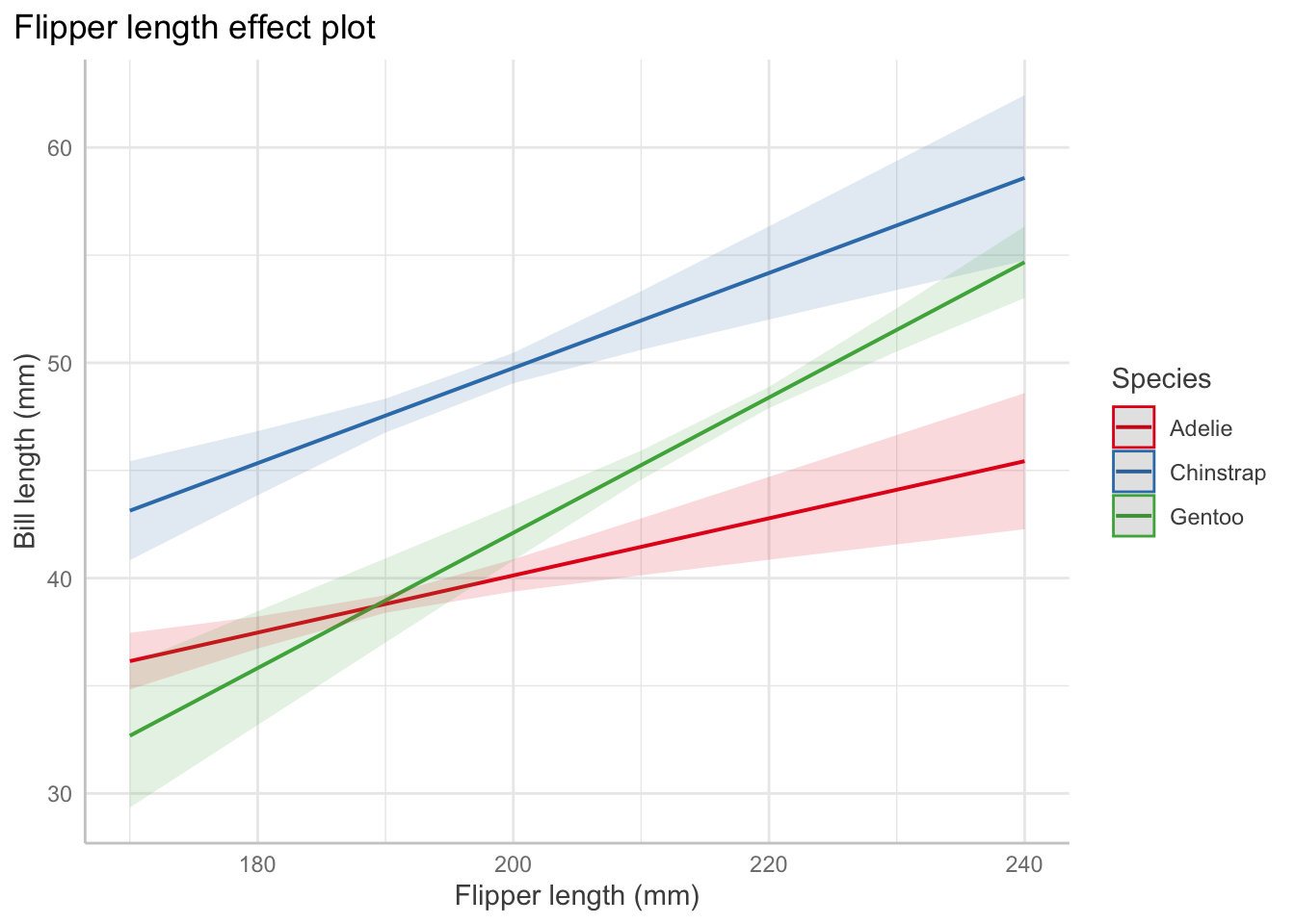 Confidence interval for a factor coefficient: For a given flipper length, gentoo penguin bills are shorter than Adelie penguin bills by an average of 34.3 mm (95% CI [15.01, 53.64]).