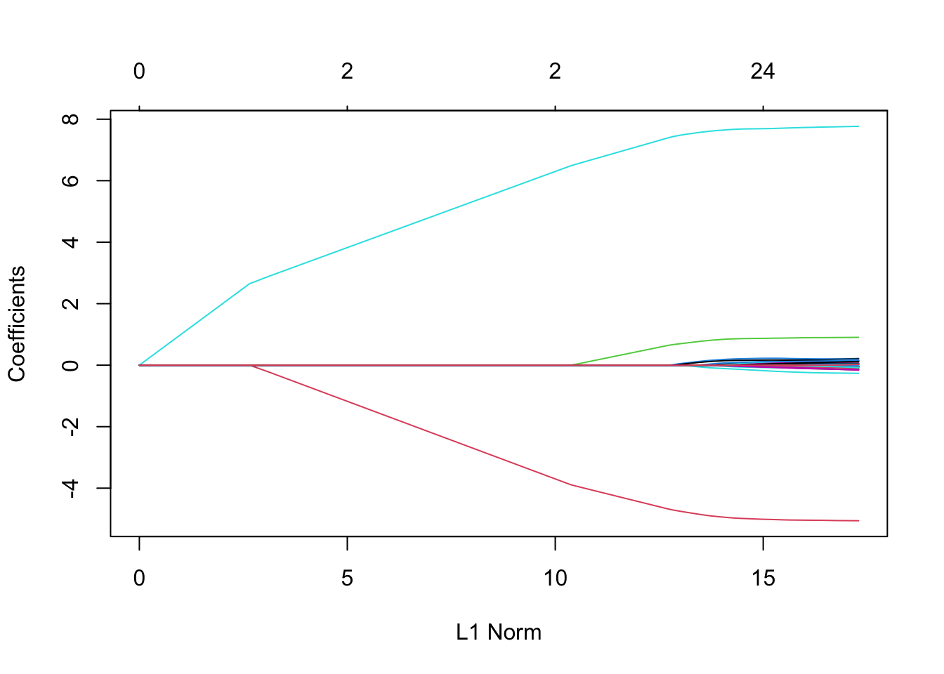 x <-model.matrix(~ . -1- y, data = sparse_samp)lasso_fit <-glmnet(x, sparse_samp$y, alpha =1)plot(lasso_fit)