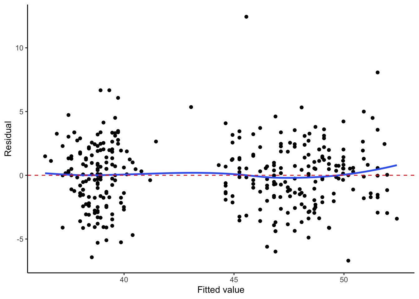 augment(penguin_fit) |>ggplot(aes(x = .fitted, y = .resid)) +geom_point() +geom_smooth(se =FALSE) +labs(x ="Fitted value", y ="Residual")+geom_hline(linetype ="dashed", color ="red", yintercept =0)+theme_classic()