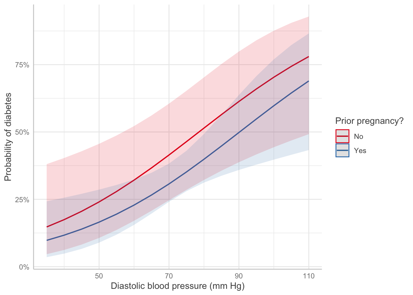 predict_response(pima_fit, terms =c("bp", "pregnancy")) |>plot() +labs(x ="Diastolic blood pressure (mm Hg)",y ="Probability of diabetes",color ="Prior pregnancy?", title =NULL)